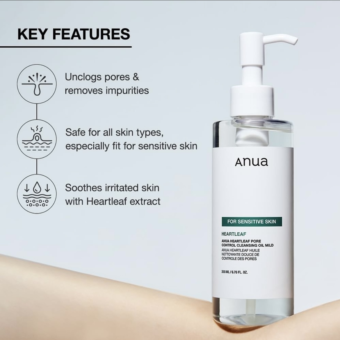 Discover the Anua Heartleaf Pore Control Cleansing Oil Mild, a non-comedogenic and fragrance-free formula designed to deeply cleanse and soothe irritated skin. Enriched with Heartleaf Extract, this mild cleansing oil effectively removes SPF, makeup, dirt, and excess oil while calming your complexion.