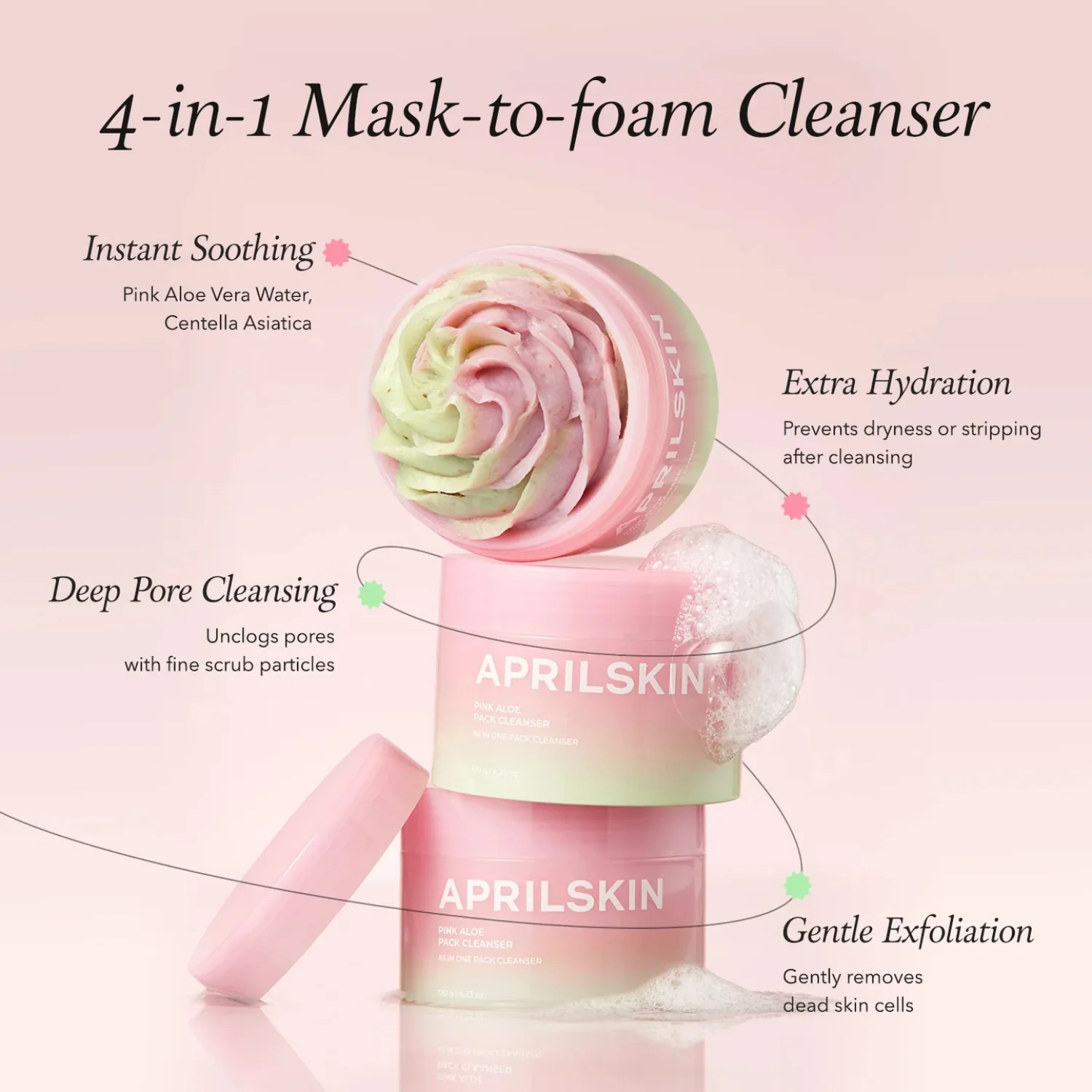 This formula is enriched with Pink Aloe Vera Water, which is 198% more soothing compared to regular aloe. It also contains Mungbean and Soybean scrub to gently cleanse the pores and smooth the skin texture. APRILSKIN Pink Aloe Pack Cleanser rapidly soothes redness, locks in moisture, and leaves skin feeling refreshed and clean.