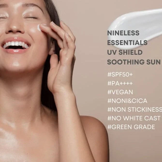 The Nine Less Essentials UV Shield Soothing Sun Cream SPF 50+ PA++++ is a clean and effective sunscreen that protects skin. It contains skin calming ingredients and leaves no white cast with a velvet matte finish.