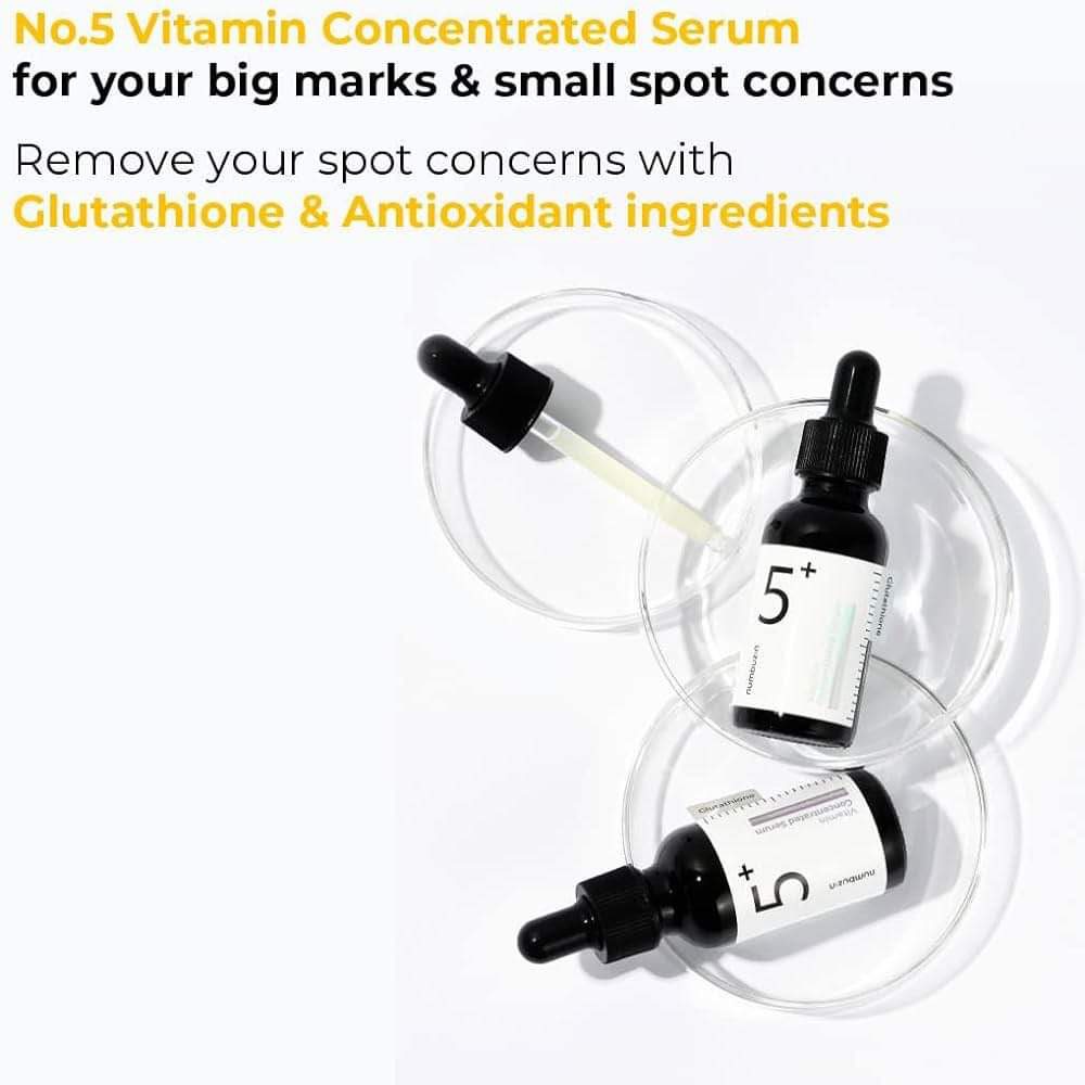 Numbuzin No.5 Vitamin Concentrated Serum helps diminish the appearance of acne scars and brightens skin tone with antioxidants, glutathione and Niacinamide.