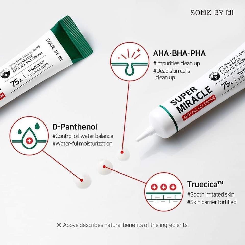 The Some By Mi AHA BHA PHA 14 Days Super Miracle Spot All Kill Cream is a spot treatment that helps treat acne by removing dead skin cells and strengthening the skin barrier. Formulated with Truecica™ to soothe skin and reinforce skin barrier, while D-Panthenol helps moisturise and maintain the optimal oil-water balance. With a lightweight and clear gel-like texture, the Super Miracle Sport All Kill Cream allows for smooth application and a fresh, non-greasy finish.